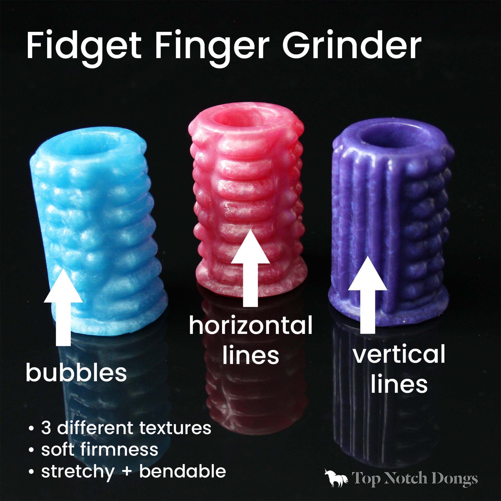 Fidget grinder na prst má dohromady 3 různé stimulující textury - vertikální vroubky, horizontální vroubky a bublinky. Můžete grinder používat nasazený na prst, nebo ho držet jenom v ruce, případně používat i v horizontální poloze
